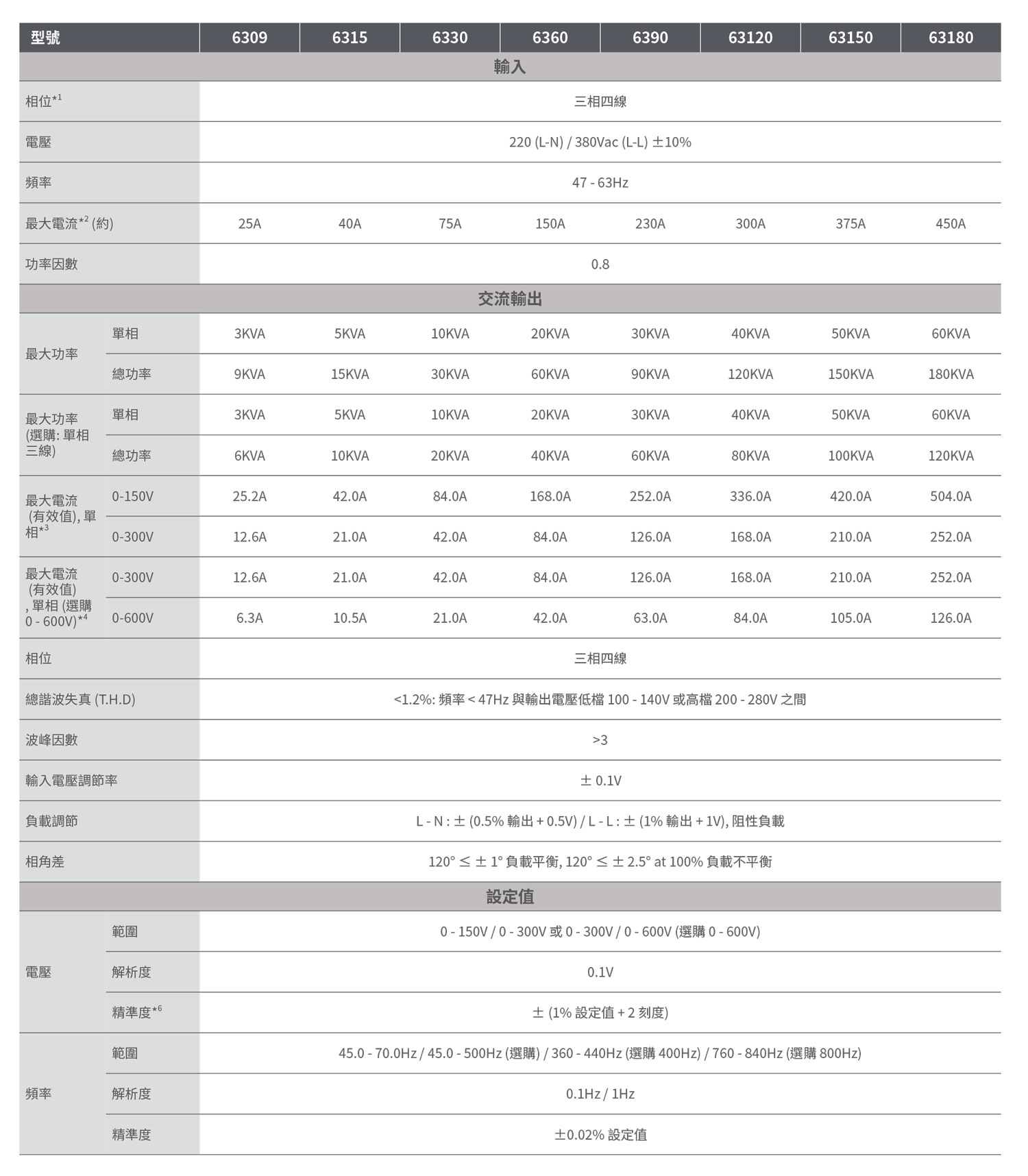 可程式三相輸出,採用 IGBT / PWM 脈寬調(diào)變技術(shù) (Switching) 設(shè)計,省電省空間。輸出電壓設(shè)定範圍0 - 300V,頻率設(shè)定範圍45-70Hz,另可選購單相 3線輸出、0 - 600V 電壓、360-400Hz 或 760-840Hz 輸出功能。