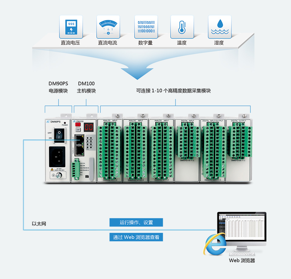 DM100 數(shù)據(jù)采集記錄儀可高精度采集直流電壓、直流電流、數(shù)字量、溫度、濕度等多種傳感器信號數(shù)據(jù),實(shí)時顯示多種測量結(jié)果,并對測量結(jié)果進(jìn)行自定義二次運(yùn)算、報警輸出等操作。通過模塊化的設(shè)計構(gòu)架,DM100最多可擴(kuò)展至200個采集通道,適合工業(yè)環(huán)境中的多通道數(shù)據(jù)采集記錄