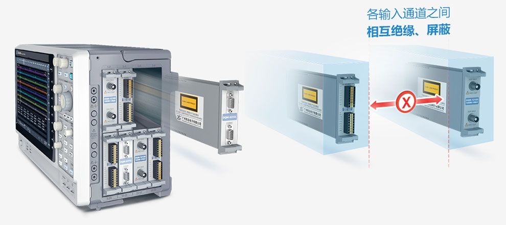 每臺(tái)示波記錄儀標(biāo)配8個(gè)板卡卡槽,各輸入通道之間相互絕緣隔離,可最大程度確保在強(qiáng)干擾、多參考電壓等復(fù)雜環(huán)境下的精確測(cè)試。