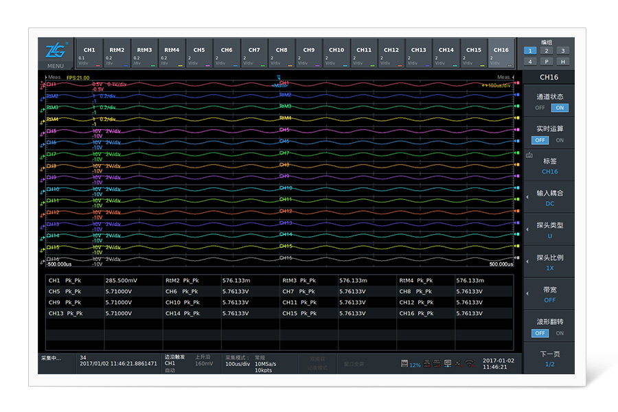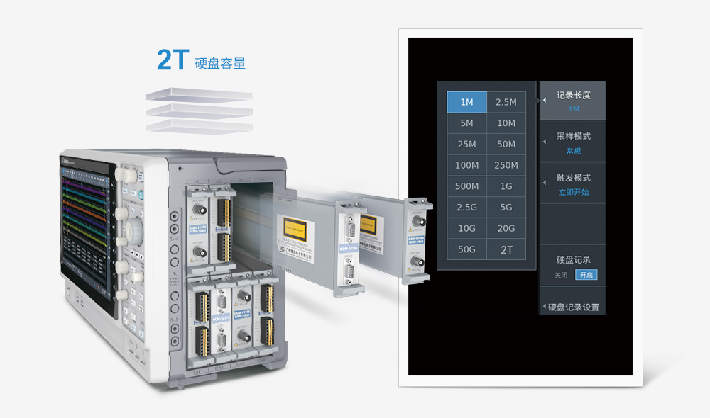 在示波模式下,實(shí)時(shí)波形存儲(chǔ)深度高達(dá)2Gpts,配合最高可達(dá)100MS/s采樣率的板卡,非常適合長(zhǎng)時(shí)間的波形采集。如果8個(gè)卡槽全部選配,可輕松實(shí)現(xiàn)16通道隔離示波器功能。