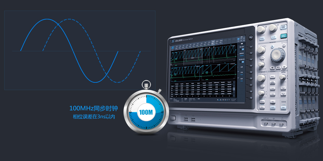 示波記錄儀內(nèi)部設(shè)有高穩(wěn)定性溫度補(bǔ)償?shù)?span lang="EN-US">100MHz同步時(shí)鐘,避免了溫度帶來(lái)時(shí)鐘漂移所引入的測(cè)量誤差。同時(shí)也保證了每一個(gè)通道ADC的采樣相位同步,減少了測(cè)量時(shí)通道間相位角所引入的誤差,誤差在3ns以內(nèi),保證所有通道信號(hào)同步測(cè)試。