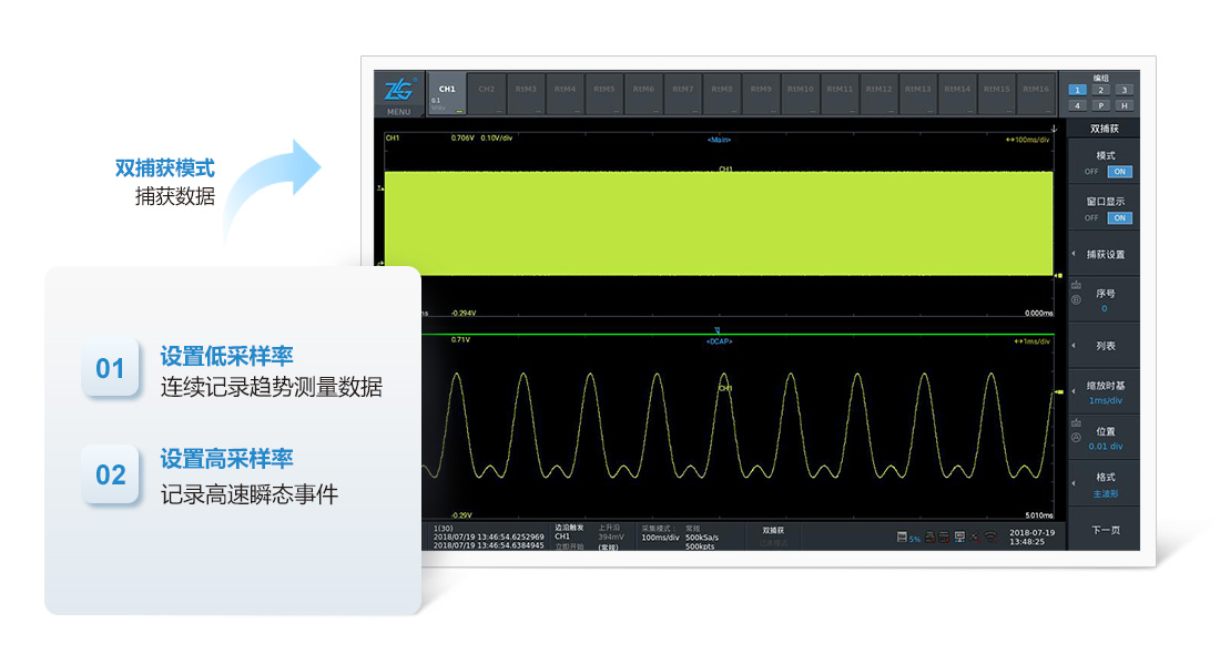 長(zhǎng)時(shí)間的趨勢(shì)數(shù)據(jù)通常采用低采樣率采集趨勢(shì)數(shù)據(jù),但突發(fā)的高度瞬態(tài)異常信號(hào)需要采用高采樣率捕捉。通過(guò)雙捕獲功能,可以同時(shí)設(shè)置兩個(gè)不同的采樣率來(lái)滿足數(shù)據(jù)捕獲要求。在波形處于正常狀態(tài)時(shí),保持低采樣率記錄波形變化趨勢(shì),一旦波形滿足觸發(fā)條件,示波記錄儀將立即切換到最高100MS/s的速度記錄高速瞬態(tài)事件。