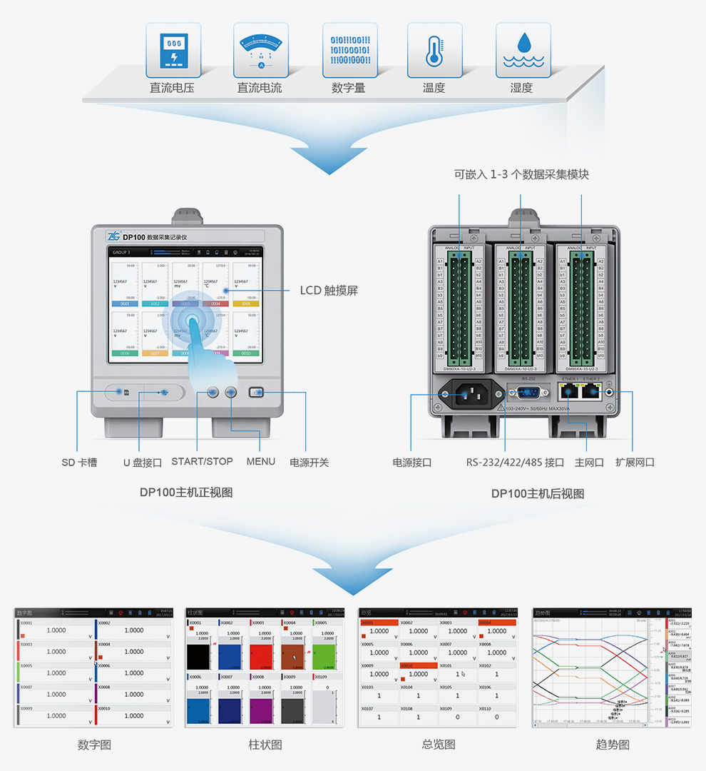 DP100數(shù)據(jù)采集記錄儀,由DP100主機(jī)和高精度數(shù)據(jù)采集模塊組成,單臺(tái)主機(jī)可嵌入1-3個(gè)數(shù)據(jù)采集模塊,支持多機(jī)級(jí)聯(lián),全面采集直流電壓、直流電流、數(shù)字量、溫度、濕度等多種傳感器信號(hào)。配備5.7英寸LCD觸摸顯示屏,適合實(shí)時(shí)觀測(cè)與操作。