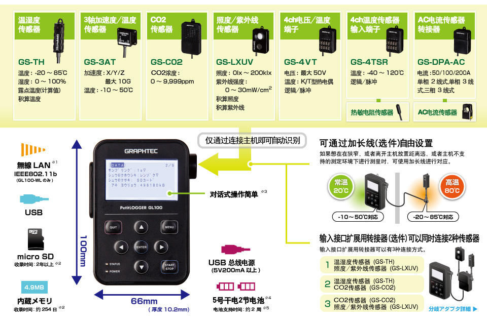 | 能連接的傳感器 | GS-TH、GS-CO2、GS-LXUV (同一傳感器不可) |